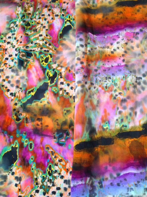 Two Old sample images, printed onto both sides of fabric using a Digital Textiles Printer. Manipulated with spraying water to create a bleed between both Designs